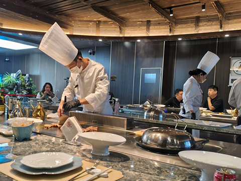 鐵板燒秀:餐廳有現(xiàn)場鐵板燒秀,廚師在鐵板上現(xiàn)場烹飪,不僅能讓顧客品嘗到美味,還能欣賞到精彩的廚藝表演。